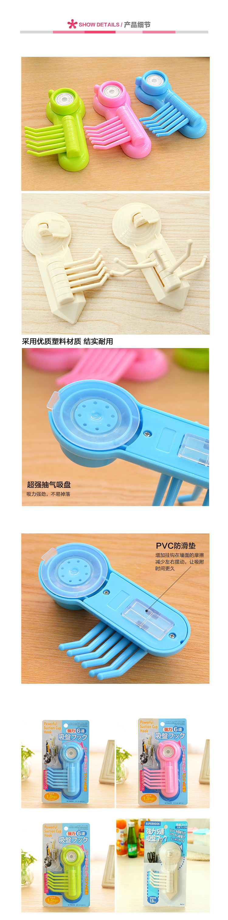 (买1送1) 炫彩强力吸盘无痕六爪挂钩 创意多用途小物件挂钩