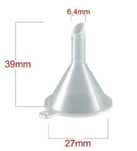 -. Feature : Pouring End Dim: 27mm (1-1/16") / Spout End Dim: 6.4mm(1/4") / Length Dim: 39mm(1-9/16") / The mini funnels Made from polypropylene plastic / Great for Sand Art and pouring room temperature essential oils