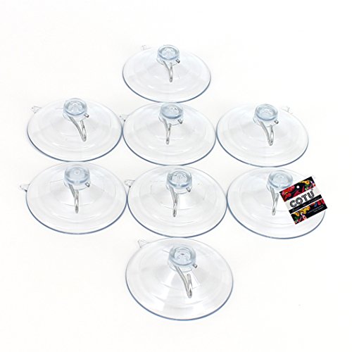 -. Feature : It comes with 8 pack of COTU (R) large suction cups with hooks. Cup size diameter is 2 1/2". Each cup can hold up to 8 lbs of weight / Use our US Made Suction Cup Hooks to create convenient hanging space for items such as stringed lights, wreaths, decorations or other items / Our Suction Cups can be attached to any smooth, non-porous surface like window glass, mirrors, fiberglass, tile or metal. / Made of high quality clear plastic material that can resist yellowing. You can attach most items on the metal hook design with ease. You can use the cups at home, office, bathroom, kitchen, garage and anywhere else you can think of / COTU (R) is a US registered trademark and is sold exclusively by Mighty Gadget USA Merchant