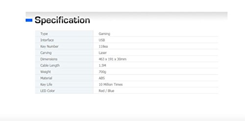 Interface: USB / Key Number: 1118ea / Carving: Laser / Dimensions: 463x191x30mm / Cable Length: 1.5M / Weight / 700g / Material: ABS / Key Life: 10 Million Times / LED Color: Red & Blue