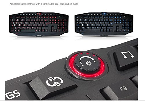 5 programmable keys for gaming. 7 programmable keys for multimedia. Player Play/Pause Stop Volume Down Mute Volume Up Windows Key Lock. Press the "M" key positioned to the left of "G1" key to call the 3 kinds of preset profiles sequentially. Adjustable light brightness with 3 light modes- red, blue, and off mode.