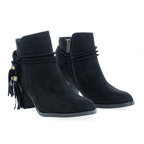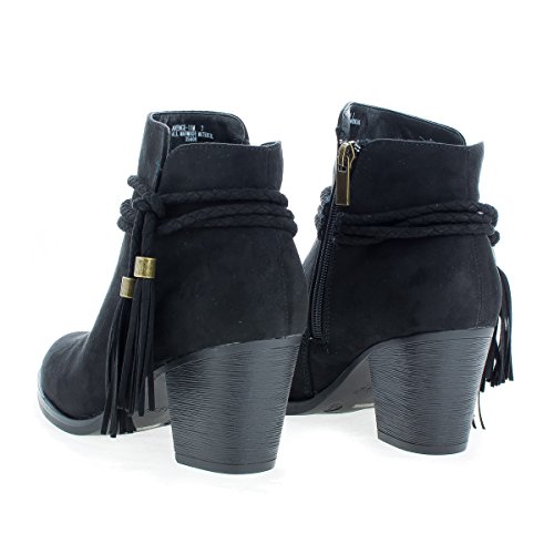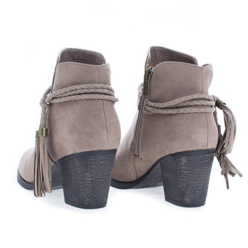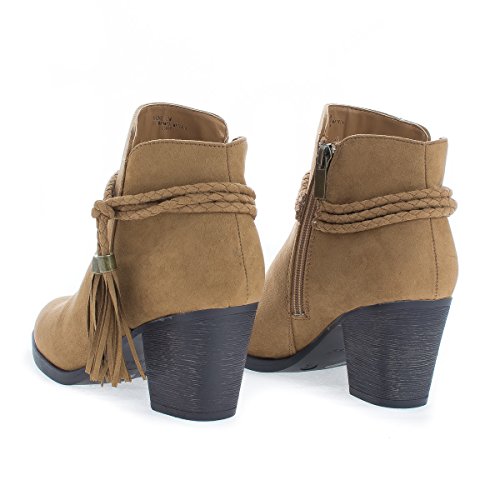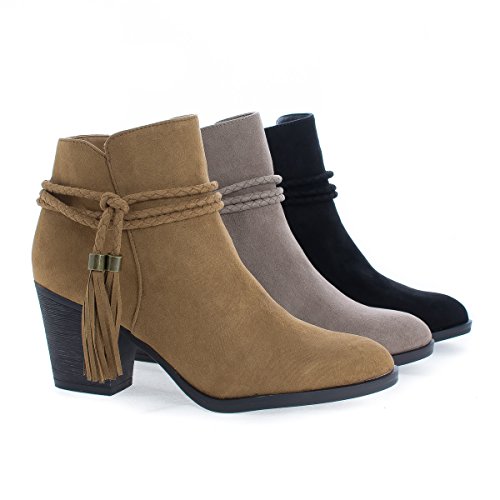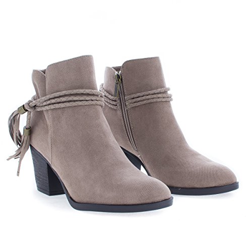 Binding : Apparel Product Description Walk in fashion and comfort in these western inspired ankle high heel boots, featuring an almond toe, contrast stitching, a braided laced tassel, a side zipper for easy wear and closure, a slightly padded insole for comfort, and an approximate 2.75 inch high stacked chunky heel. (Please note that these measurements are based on a size 7). Style fits true to size. Available in Black, Taupe (Gray), Natural (Brown), etc. All man made materials. By Aquapillar 0