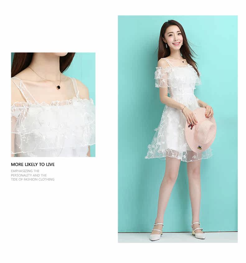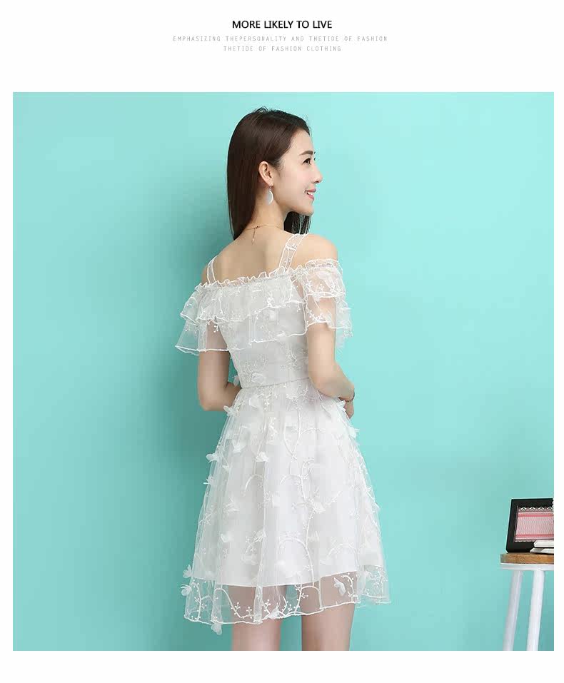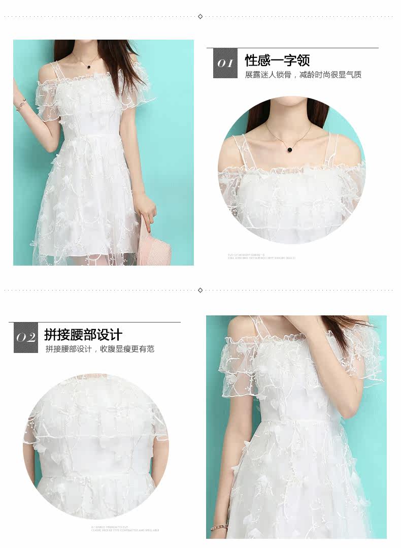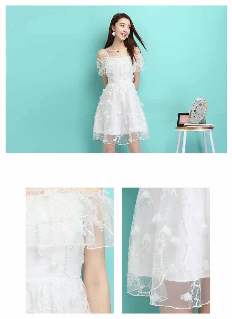 夏季一字领吊带裙 透视感露肩连衣裙 婚宴礼服网纱绣花短裙