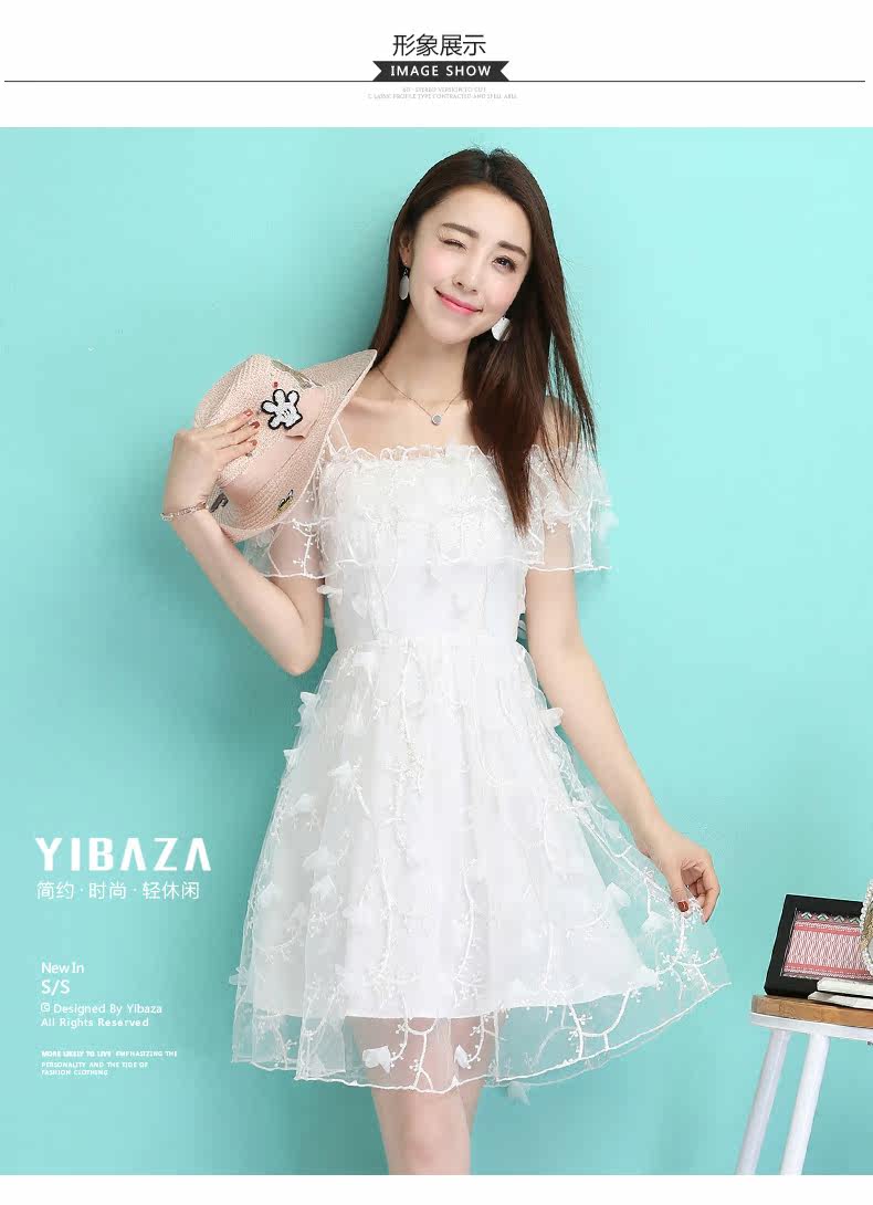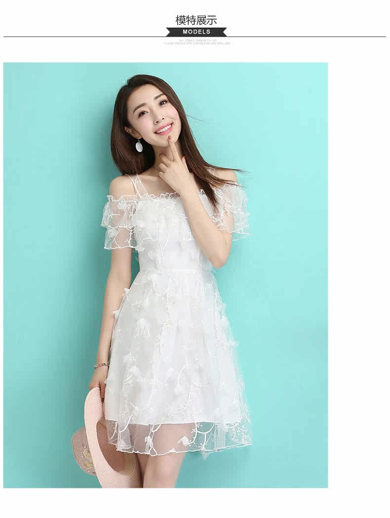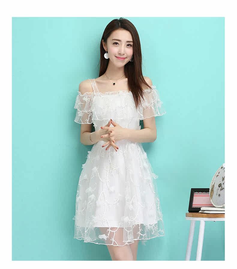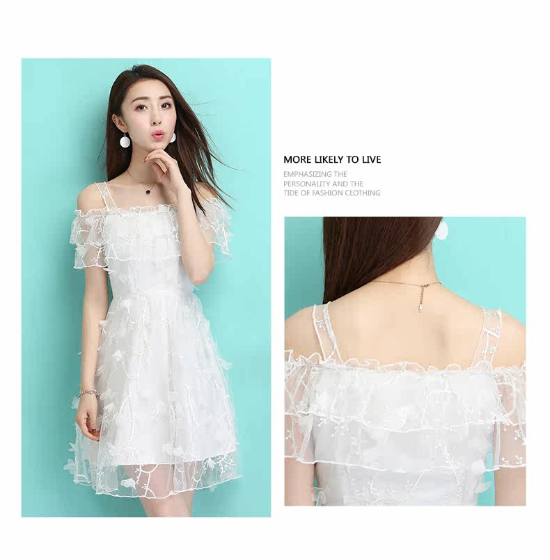 夏季一字领吊带裙 透视感露肩连衣裙 婚宴礼服网纱绣花短裙