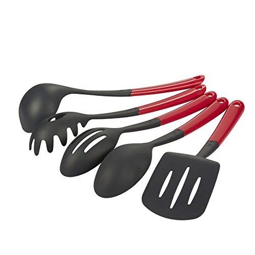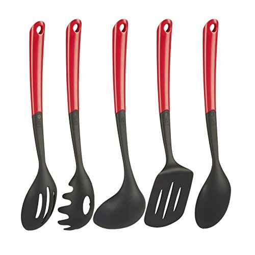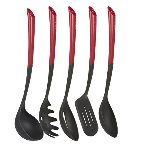 Cooking Utensils Set - Kitchen Premium Nylon Cooking Tools with Polypropylene Handles - Includes Ladle, Spatula Turner, Spoons, and Pasta Server - Red - 5-Piece Set