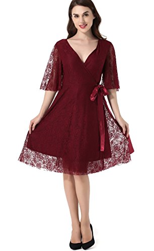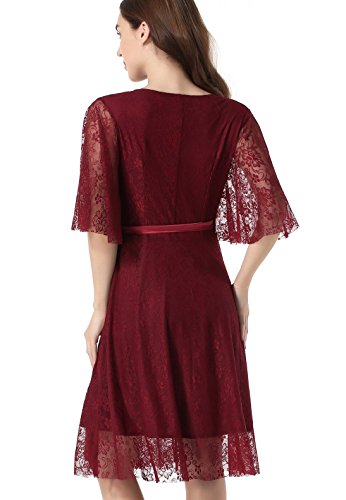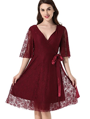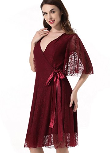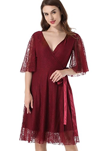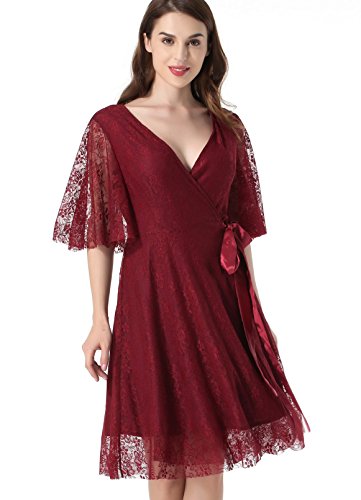 Women's Lace 1/2 Sleeves Midi Business Cocktail Short Formal Wrap Dress Red Wine Large