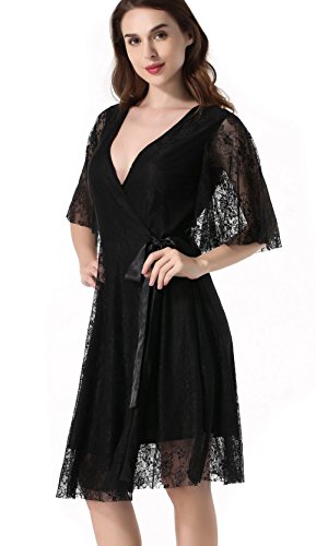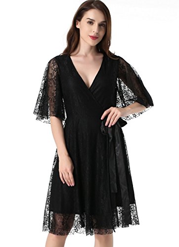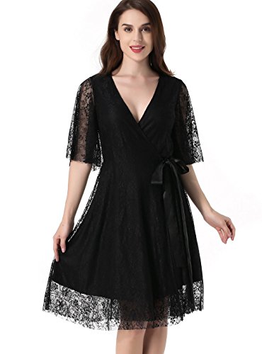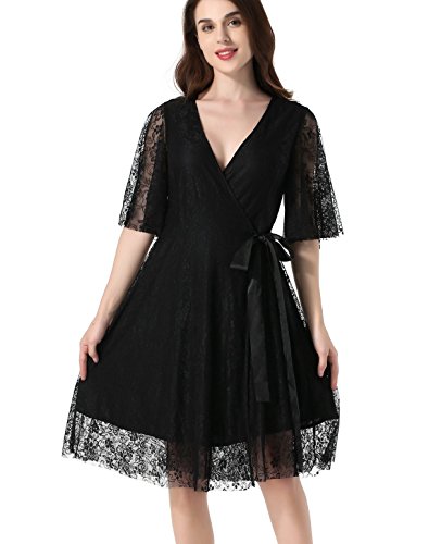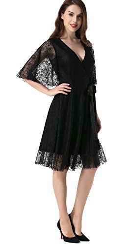 Women's 1/2 Sleeve Floral Lace Elegant Cocktail Dress V Neck Knee Length for Party Black Large