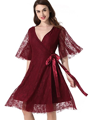 Women's Lace 1/2 Sleeves Mother Of The Bride Cocktail Wrap Dress Red Wine Small