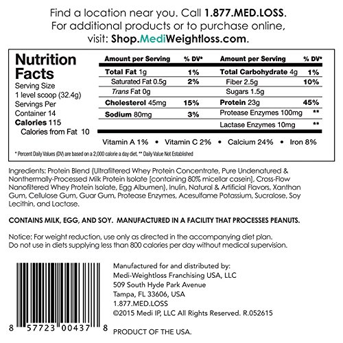 -. Binding : Health and Beauty -. Brand : Medi-Weightloss -. EAN : 0857723004378 -. Feature : Sustained-Release Formula / Excellent Source Of Protein (23g and 45% of Daily Value) / Only 115 Calories Per Serving and 4g Carbs / Assists With Maintaining And Increasing Lean Muscle Mass. Great For Hunger Control During Weight Loss / Quick and Easy to Prepare. Great Source of Calcium (24% of Daily Value) -. IsAdultProduct : 0 -. Label : Medi-Weightloss -. Manufacturer : Medi-Weightloss -. MPN : na -. PackageQuantity : 1 -. PartNumber : na -. ProductGroup : Health and Beauty -. ProductTypeName : HEALTH_PERSONAL_CARE -. Publisher : Medi-Weightloss -. Studio : Medi-Weightloss -. Title : Medi-Weightloss Vanilla Premium 3 Protein Blend Shake Powder - High Protein (23g) - For Hunger Control During Diet/Weight Loss - 1 lb Canister -. UPC : 857723004378