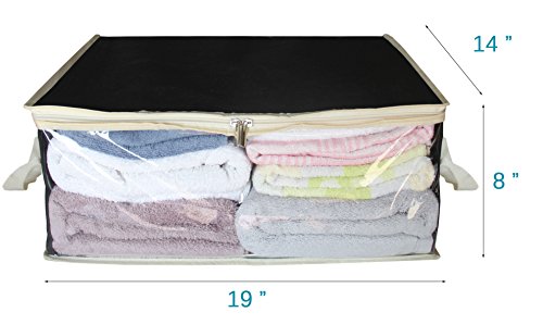 Specification: -The dustproof material of comforter storage bags allows air to circulate so that the items inside will smell fresh for a longer period of time. -Easily to pull out with the 2 built-in handles on both ends. -The underbed storage organizer is breathable and the front is clear so you can see what you have put into it and it protects everything from mold. -Excellent under bed storage for just keeping things organized under the bed or closet and making it infinitely more orderly. -This linen storage containers perfect for organizing pillow, sheet, bedding and storing clothes, also works well for Holiday Decor, such as gift paper, gift wrap tissue.