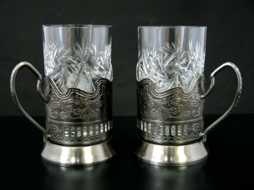 -. Feature : Old World Vintage Design / Set of 2 Russian cut crystal glasses w/metal holders / Crystal glasses are suitable for hot or cold liquids / 8 oz glass is slightly tapered from top to bottom measuring 2 3/4