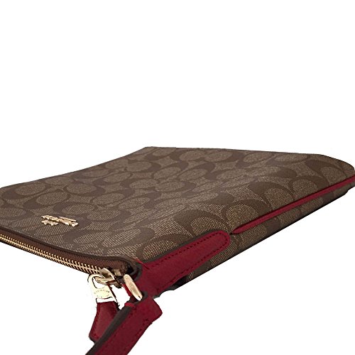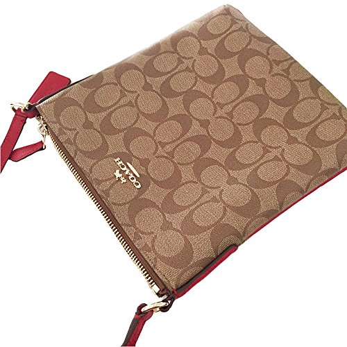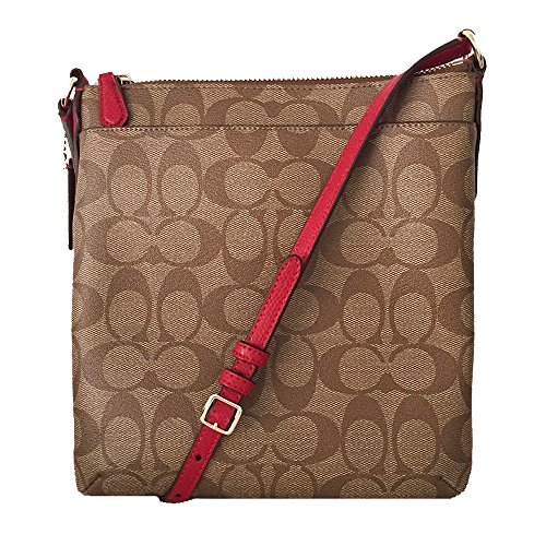 coach womens crossbody handbag leather signature khaki brown&classic red size 8.5*8*1/strap 22"