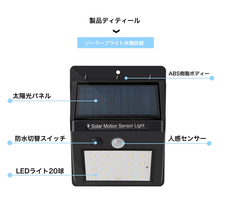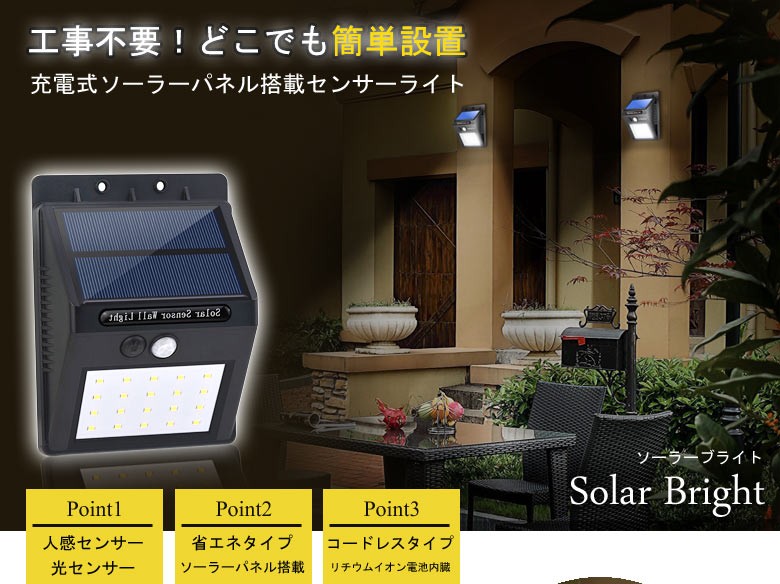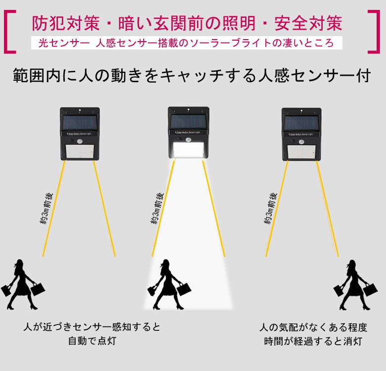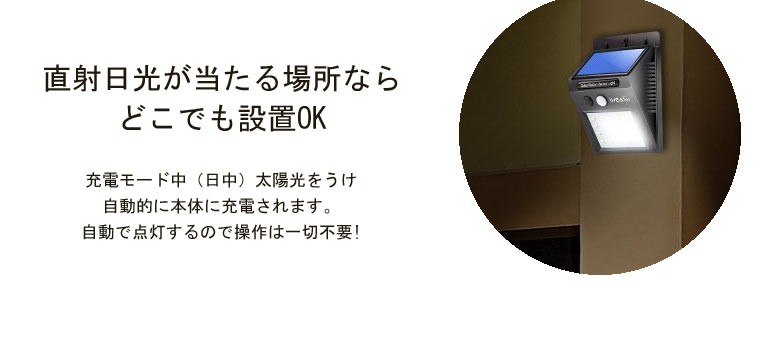 ※ご使用する際には、十分な太陽光充電を行った後にご使用下さい。 ※必ず直射日光の当たる場所に設置してください。 ※照明性能は、使用環境によって、異なる場合もございます。 ※太陽光があ当たらない日(曇りや雨など天候の悪い日)は充電が 十分に行われない場合もあり、点灯時間が短いか点灯できない場合もあります。