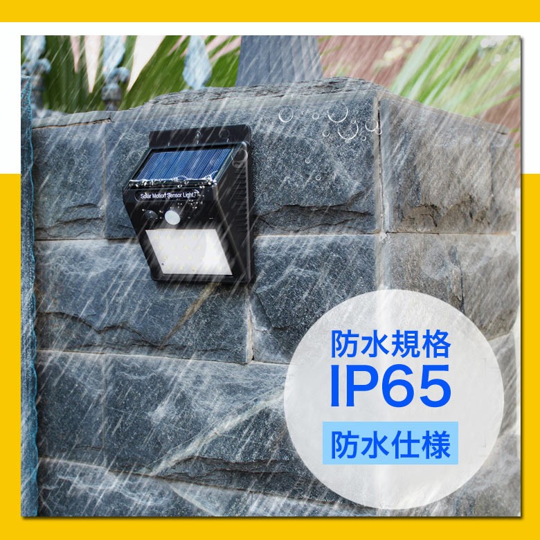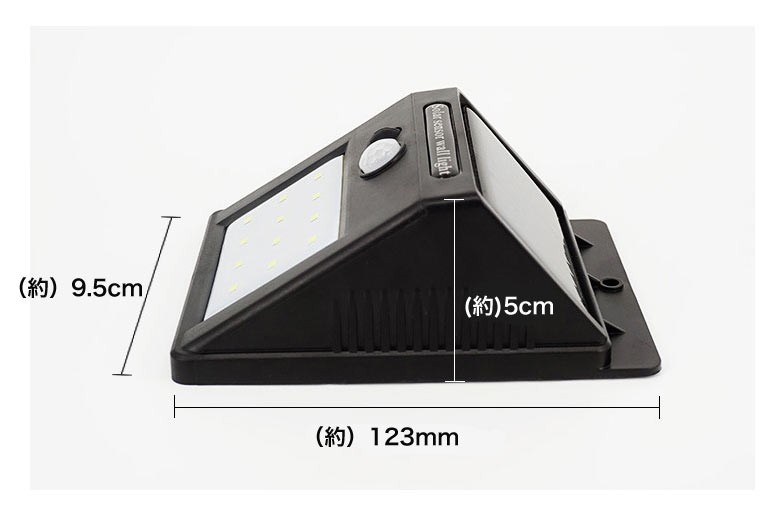 【仕様】 【サイズ】:9.5cm×12.3cm×5cm 【日照充電時間】:約8時間〜9時間で満充電 【バッテリー】リチウムイオンバッテリー/3.7V/12000mah 【ソーラーパネル】0.55w 【防水規格】:IP65 ※雨の日でも動作しますが完全防水ではありません。 どしゃ降りの雨天での使用や、水に沈むなどの状況は故障の原因となりますので 取扱いにはご注意ください。 【電圧】6(V) 【防水規格】:IP65 【照明範囲】約20平方