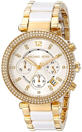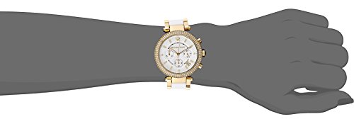 -. Binding : Watch -. Brand : Michael Kors -. Color : Gold/White -. Department : womens -. EAN : 0696746181730 -. Feature : Yellow gold-tone watch featuring inset crystals at bezel and hour markers, three chronograph subdials, and date window / 39 mm stainless steel case with mineral dial window / Quartz movement with analog display / Gold-tone bracelet featuring white center links and fold-over clasp with double push-button safety / Water resistant to 100 m (330 ft): In general, suitable for swimming and snorkeling, but not scuba diving -. Label : Michael Kors Watches MFG Code -. Manufacturer : Michael Kors Watches MFG Code -. Model : MK6119 -. MPN : MK6119 -. PackageQuantity : 1 -. PartNumber : MK6119 -. ProductGroup : Watch -. ProductTypeName : WATCH -. Publisher : Michael Kors Watches MFG Code -. ReleaseDate : 2012-04-23 -. Size : Standard -. Studio : Michael Kors Watches MFG Code -. Title : Michael Kors Women's MK6119 Parker Watch With White Link Bracelet -. UPC : 796483146952 ChronographCase size: 39 mmCase thickness: 12 mmBand width: 12 mmWater resistance: 10 ATM