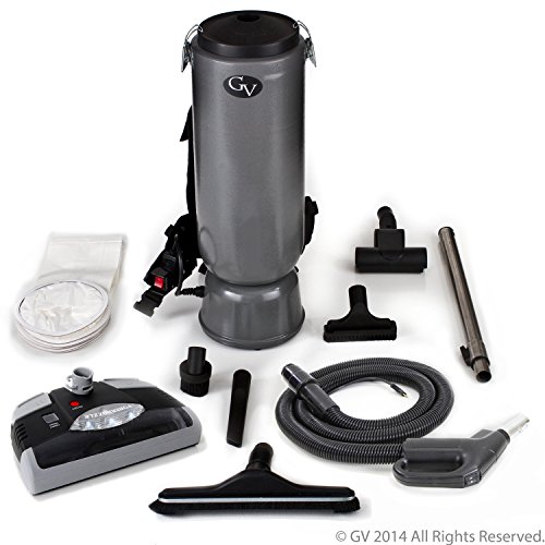 BRAND NEW FACTORY SEALED GV 10 Quart HEPA Backpack Vacuum. We have sold over 30,000 vacuum cleaners and know vacuums and this is the vacuum that we use to clean our 13,000 square foot warehouse. It quickly cleans any surface including low pile and high pile carpet. We prefer it because its the most powerful backpack and its so much faster. Aluminum construction makes it lightweight and super easy to use. Only Weighs 11 lbs! If you have lots of hard floor surfaces or furniture in your home or business then this vacuum will save you time. Has super comfortable adjustable padded shoulder and waist straps for easy comfortable cleaning. On/Off switch is attached on the belt for easy on/off, and tools can be stored on the belt as well. LOADED with Easy to use tools! Premium tools include: Crevice tool, duster brush, upholstery tool (with slide off brush), and deluxe floor tool. The floor tool is the high end which pivots so that you can vacuum side to side or in a half circle as you walk. Also comes with 6 10 quart bags! Mini Head with Brushroll - This vacuum has so much power that it easily powers the brushroll head. These mini head attachments are super popular. They can be used to vacuum throw rugs, upholstery couches or cars, stairs and work really good for pet hair. 3 stage Filtration & HEPA bags - Include 6 HEPA bags, sealed HEAP filter and 10 Quart SMS washable cloth bag. Up to 120 inches of water lift for POWERFUL deep cleaning! The GV backpack commercial vacuum is designed to be one of the most powerful vacuums made. Industries best 2 Fan Double Ball Bearing Ametek-Lamb Motor. 2 Year Motor Manufacturer Warranty.Feature