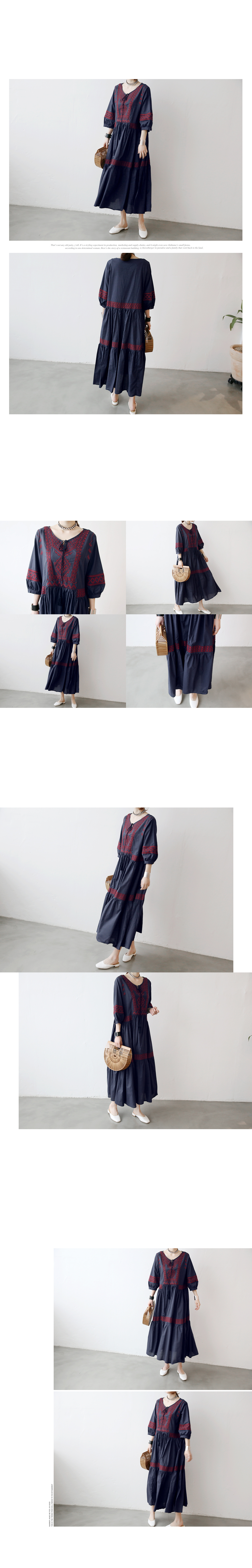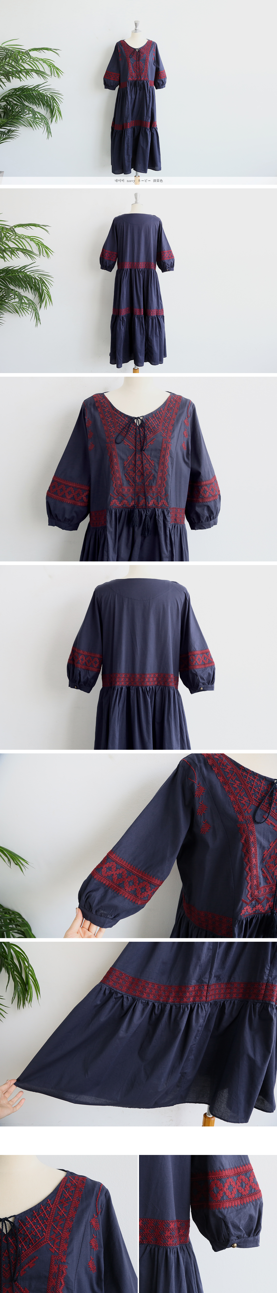 활용하기 좋은 원피스로 톤다운된 네이비 컬러에 우아한 와인컬러 자수가