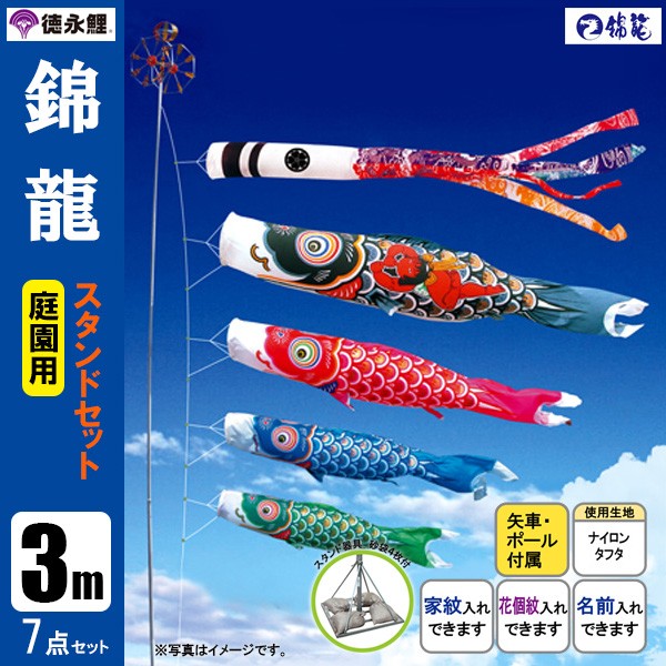 | 錦龍鯉 庭園用大型鯉のぼり スタンド砂袋式ポール付セット | 1.5m鯉3匹 | 2m鯉3匹 | 3m鯉3匹 3m鯉4匹 3m鯉5匹 | 4m鯉3匹 4m鯉4匹 4m鯉5匹 |