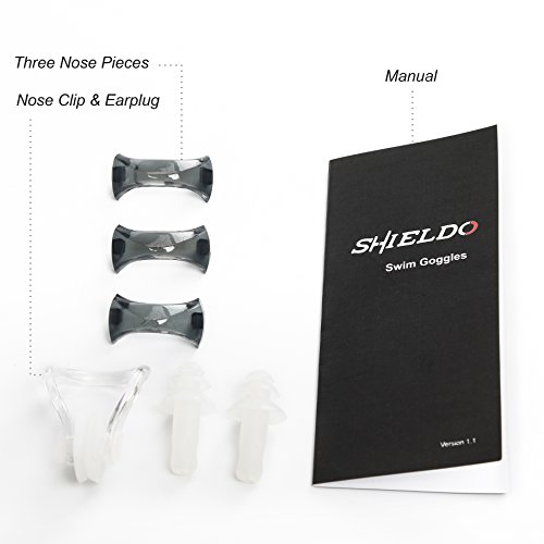 - Feature : TOP QUALITY LENS -- Made of PC material,it is durable and practical with multiple coatings such as anti -scratch layer, shatterproof layer, UV protection layer and anti-fogging layer. / THREE-SIZED INTERCHANGEABLE NOSE PIECE -- Super ductile PU material creates high toughness and ultra durability. Three size for fit achieves upmost wearing effect with comfort. / SUPER COZY WEARING EXPERIENCE -- Ergonomically-designed 3D lens keeps you far away from water-leakage annoyance, bringing super cozy experience. The additional nose clip and earplug is a perfect fit for swimming. / EXTRAORDINARILY HIGH CLARITY -- Taking PC material with precise curvature design, it is amazingly clear, reaching to 99% high light transmittance. With the enlarged frame supporting a maximum vision, it extends the view distance and effectively eases eyes fatigue. / SHIELDO WARRANTY -- One-year warranty on Goggles & 30 days money back guarantee & 100% customer Satisfaction guarantee.
