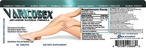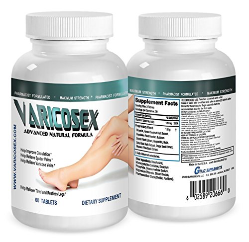-. Binding : Health and Beauty -. Brand : GRAND SUPPLEMENTS -. EAN : 0602589206660 -. Feature : VARICOSEX is the most Complete Supplement that Work to Heal Existing Varicose Veins or Spider Veins and to prevent the Formation of New Ones. It Enhance the Blood Flow by Helping the Reversal of Chronic Venous Insufficiency. † / VARICOSEX ingredients like Horse Chestnut Extract and Hesperidin help to keep the Integrity of Veins. † / VARICOSEX ingredients like Rutin and Diosmin Work to Strengthen the Vein and Capillary Structure and Prevent the Formation of new Varicose Veins. † / VARICOSEX ingredients like Grape seed Extract, Vitamin C and Butchers Broom help in Enhancing the Health of Blood Vessel and Insure Good Flow of Blood. And to Reduce Inflammation and Swelling† / Made in the USA in a c-GMP certified & FDA inspected firm. Prepared by a Pharmacist. Indorsed by Doctors. 24/7 Customer service. We Worked Hard to Develop and Research the best Formula and it will speak for itself. Results will be Surprising to you. 100% Pure, Natural and Effective and Coupled with a 30 Day Money Back Guarantee" If you are not satisfied, just ship us Back the product for a Full Refund as we are Confident in our Product". -. Label : GRAND SUPPLEMENTS -. LegalDisclaimer : †These statements have not been evaluated by the Food and Drug Administration. This product is not intended for use to diagnose, cure, treat, or prevent a disease. Always seek the advice of your health care provider with any questions you may have regarding a medical condition or any health concerns. All sales are final and you commit to accept our terms of service posted on Grand Supplements website "Terms of Service". This product is not intended to affect the structure or function of the body of humans. Your result may vary from clinical test results on product or ingredient due to a lot of factors like individual age, weight, race and other factors. All products are made in the USA. -. Manufacturer : GRAND SUPPLEMENTS -. MPN : GSV7001 -. PackageQuantity : 1 -. PartNumber : GSV7001 -. ProductGroup : Health and Beauty -. ProductTypeName : HEALTH_PERSONAL_CARE -. Publisher : GRAND SUPPLEMENTS -. Studio : GRAND SUPPLEMENTS -. Title : VARICOSEX Natural Varicose Vein Treatment, Pain Relief Pills (Clinical Strength 1600Mg). -. UPC : 602589206660