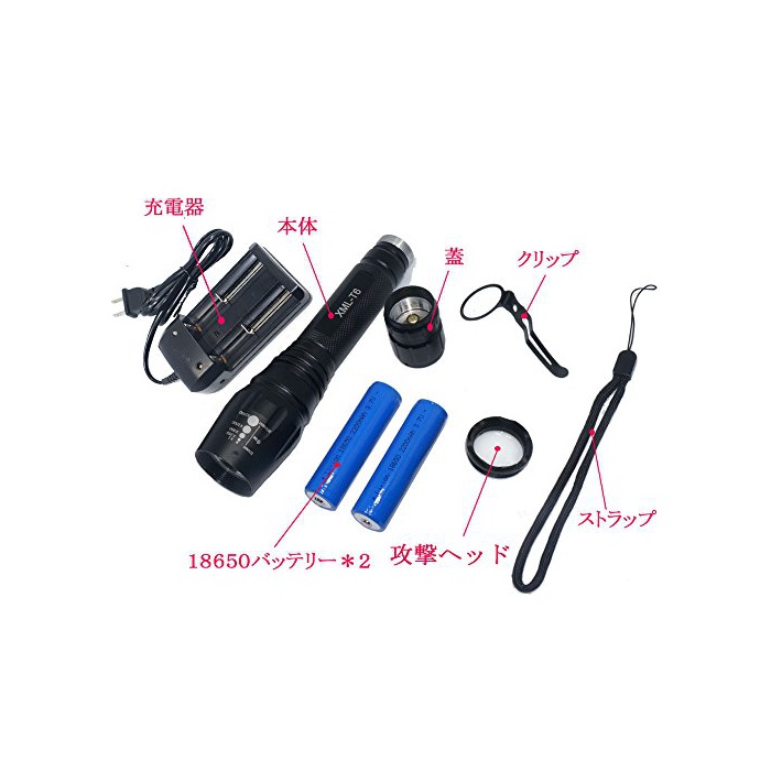 부속품: 회중전등*1,18650배터리(2200mAh)*2,수납 케이스,충전기*1(이상 온도와 스쳐 충전 보호 기능 부착 때문에,안심 하십시오.)
