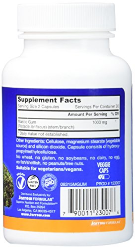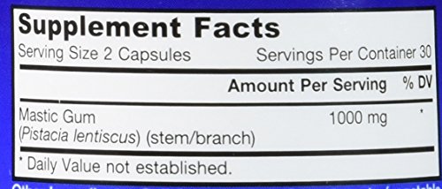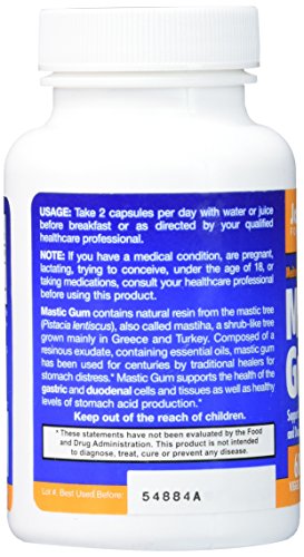 Mastic Gum 500 mg 60 CapsuleProduct DescriptionMastic Gum contains natural resin from the mastic tree (Pistacia lentiscus), a shrub-like tree grown mainly in Greece and Turkey. Composed of a resinous exudate, containing essential oils, mastic has been used for centuries by traditional healers for stomach distress.* Mastic Gum supports gastric and duodenal cells and tissues.