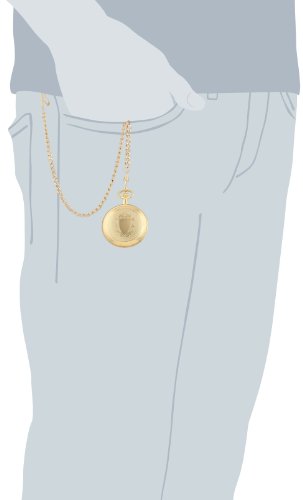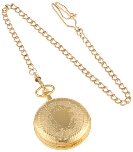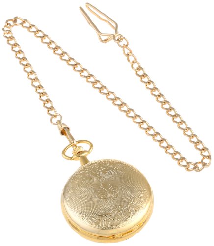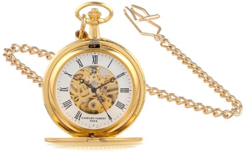 -. Feature : 14k gold-plated brass 47mm double hunter case with a matching curb chain / Skeleton dial with roman numerals / 17 jewel mechanical movement / Deluxe gift box