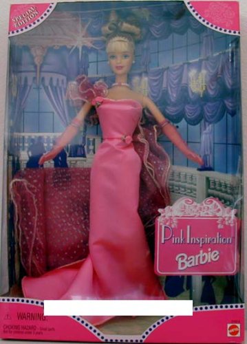This is a brand-new never removed from box 1998 doll. Pink inspiration Barbie. Barbie excitedly opens a small, pretty envelope. Printed in the most delicate of letters, the card inside reads: you are cordially invited to attend our annual celebration on the 28th of this month. Please wear pink.