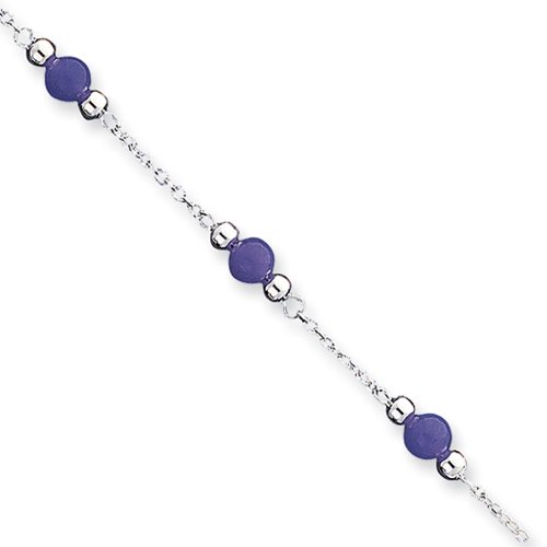 Polished 6mm spheres of lavender jade punctuated by gleaming silver balls on this stunning 9-inch ankle bracelet will subtly enhance your look with its sleek and bold style. Created from tarnish resistant rhodium-plated sterling silver and fastens to your ankle with a secure, spring ring clasp. Color range varies on all natural stones so please allow for slight variations in shades.Feature