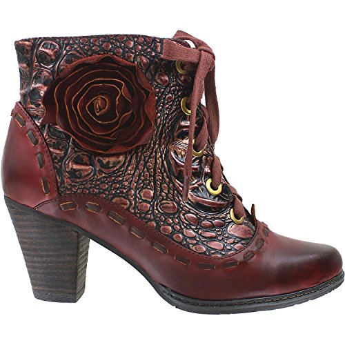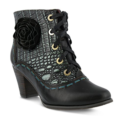 Product DescriptionHand painted smooth and croco embossed leather lace-up bootie styled with leather flower embellishment and contrast whip stitching.0