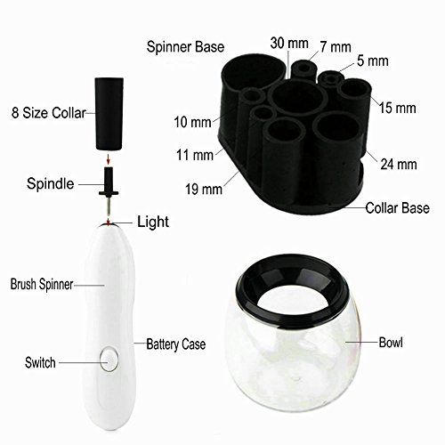 - PACKAGE Include - User manual, electric spinner, 8 different sized collars(5mm, 7mm, 10mm, 11mm, 15mm, 19mm, 24mm, 30mm), spinner spindle, spinner collar base, Plastic Bowl with Splash Guard Ring, Free Travel Pouch (batteries are not included – requires two AAA batteries)