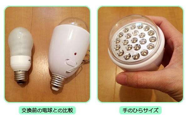| 仕様 | 口金サイズ:E26 スイッチポジション:DC・OFF・AC 電球寿命:約40000時間 バッテリー寿命:使用条件により異なります。 全光束:123ルーメン 直下照度:約47ルクス(1mで) 定格電圧:100V 消費電力:1.6W 色温度:3500度 取扱説明書(パッケージに記載) |