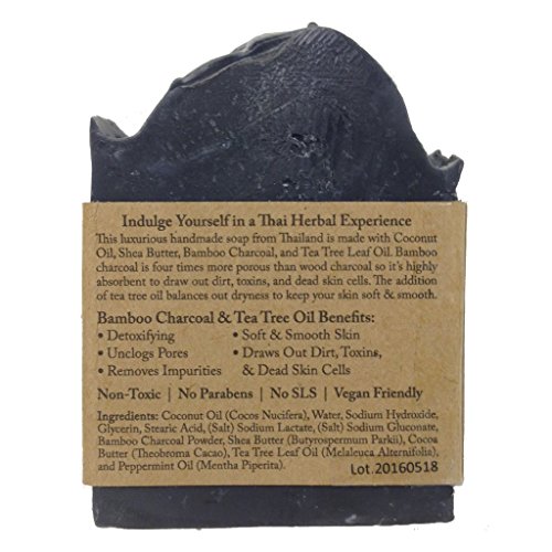 This luxurious handmade soap from Thailand is made with Coconut Oil, Shea Butter, Bamboo Charcoal, and Tea Tree Leaf Oil. Bamboo charcoal is four times more porous than wood charcoal so it's highly absorbent to draw out dirt, toxins, and dead skin cells. Great for cleansing skin that has acne, blackheads, and more. Since bamboo charcoal can be a bit drying, the addition of tea tree oil balances out the dryness and keeps your skin feeling soft & smooth. Give it a try and see how your skin will feel. Contains no toxic chemicals, no Parabens, no SLS, and is Vegan Friendly. Made in Thailand.