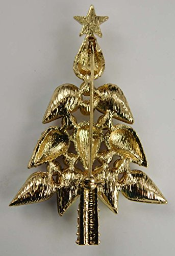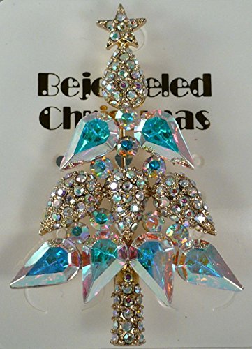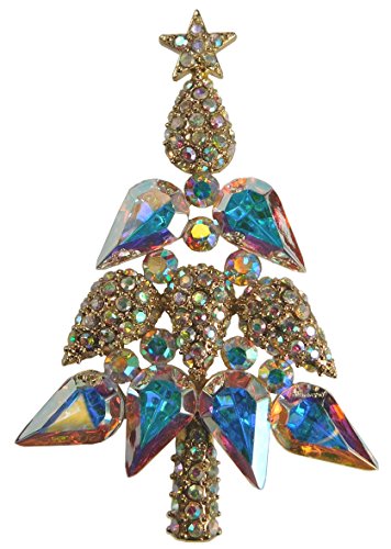 Brighten your winter days with this delightful glittering aurora borealis goldtone Christmas tree brooch. Lavished with genuine Austrian rhinestones in round and pear shapes. About 2 1/4 inches long and 1 1/2 inches wide. Sparkle plenty! Pin back with safety C clasp. Not for children age 12 and under. Made in China.Feature