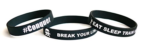 Studio : sportwristbands.net Publisher : sportwristbands.net Binding : Misc. Product Description YOUR PERSONAL FITNESS MOTIVATION ☆ ☆ ☆ ☆ ☆ Band 1: #Conquer #Conquer (black) Band 2: BREAK YOUR LIMITS (black) Band 3: EAT SLEEP TRAIN REPEAT (black) Shipping Amazon gives a shipping duration to America/Canada/Mexico of 31 days. According to our experiences, in 99% the shipping time is below 12 days! You can also choose three individual wristbands from our collection below! Just write us an email or a "message to the seller" directly after the payment process with your whished ones. BLACK COLOURED: 1. EAT SLEEP TRAIN REPEAT 2. BEASTMODE [ON] 3. BREAK YOUR LIMITS 4. #Conquer 5. train.insane.or.remain.the.same 6. Veni Vidi Vici (not debossed) GRAY COLOURED: 7. NO PAIN NO GAIN (dark gray) 8. #eatclean #trainhard (dark gray) 9. 100% HARDCORE 10. no.excuses 11. #crossfit WHITE COLOURED: 12. EAT SLEEP TRAIN REPEAT 13. GO HARD OR GO HOME 14. SHREDDED AESTHETICS 15. train.harder.become.stronger 16. work.out 17. SHUT UP AND TRAIN For questions, do not hesitate to contact us! 0