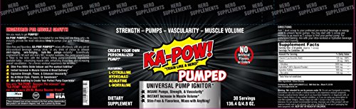 Are you ready to get PUMPED? KA-POW! PUMPEDTM has been formulated for one thing and one thing only-to instantly provide the most ridiculous bleep'n pumps your gym mirror has ever seen! Stim-free and flavorless, KA-POW! PUMPEDTM mixes effortlessly with any pre or intra-workout beverage, energy drink, or any drink of choice to unleash shirt-ripping, vein-bulging, hulk-like pumps--instantly! Scientifically engineered to hit each and every NO2 receptor available, this pump powerhouse is filled to the brim with the hardest hitting pump-producing ingredients available today-- volumizing muscle cells, enhancing blood flow, and increasing overall vasodilation-- for a heroic workout experience like no other. -Stim-Free Nitric Oxide Inducer and Pre-workout Additive -Instant Increase in Muscle Volume & Blood Delivery -Explosive Strength, Power, & Enhanced Vascularity - No Artificial Dyes, Flavors, Or Sweeteners -Mix with Anything to Create Your Perfect Pump Experience!Feature
