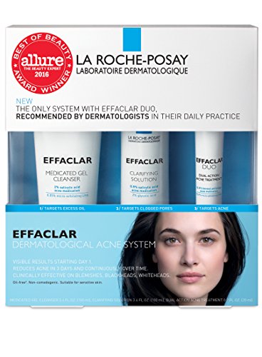 -. Feature : Reduces up to 60% of acne in 10 days / Visible results starting after 3 days / Oil-free formula that targets the major causes of acne as observed by dermatologists / Formulated with Salicylic Acid, Glycolic Acid and Benzoyl Peroxide (BPO) / Contains: acne wash/acne cleanser, acne facial toner, acne spot treatment cream / Three-step system clinically effective on blemishes, blackheads and whiteheads / Skin's overall appearance is improved starting day one, reduces acne in three days and continuously over time / Suitable for sensitive skin / Oil-free, Non comedogenic, fragrance-free, paraben-free / Kit includes Effaclar Medicated Gel Cleanser 3.4 ounce, Clarifying Solution 3.4 ounce and Effaclar Duo .7 ounce