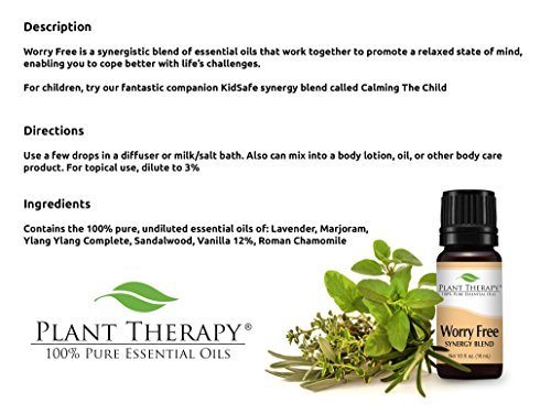 -. Feature : THE HIGHEST QUALITY: Our Worry Free Synergy is created with only premium oils and is formulated by the industry's foremost experts to ensure a quality product. / 100% PURE ESSENTIAL OIL SYNERGY: Contains a unique blend of Lavender, Marjoram, Ylang Ylang Complete, Sandalwood, Vanilla and Roman Chamomile. / NATURAL STRESS RELIEF: Keep this convenient Worry Free Synergy rollerball available as needed throughout your day. The aroma of Worry Free releases tension and calms agitated nerves. / QUESTIONS? GET IN TOUCH! If you have questions about Worry Free Synergy, Plant Therapy's certified aromatherapists are happy to help via Amazon Messages. We welcome your questions and input!
