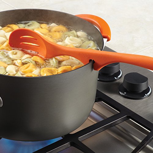 -. Binding : Kitchen -. Brand : Rachael Ray -. Feature : Orange / Side notch lets the spoon rest on the side of pots and pans when not in use, keeping drips off countertops / Dishwasher safe for easy cleanup / Durable, contoured silicone is heat resistant to 500 o F / Quality Assurance Guarantee -. Label : Rachael Ray -. Manufacturer : Rachael Ray -. PackageQuantity : 1 -. ProductGroup : Kitchen -. ProductTypeName : KITCHEN -. Publisher : Rachael Ray -. Studio : Rachael Ray -. Title : Rachael Ray Tools and Gadgets Lazy Slotted Spoon
