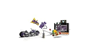 Catwoman™ has robbed the jewelry store and is about to get away on her powerful Catcycle. Rush to the scene of the crime with Batgirl™ and Robin™ to intercept her. Watch out for Catwoman’s lashing whip and the falling lamppost she knocks over with her bike. Attack with Batgirl's Batarangs and leap off the roof of the store onto the Catcycle with Robin. Capture this Super-Villain and return the jewels!