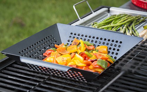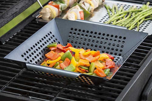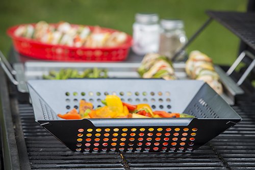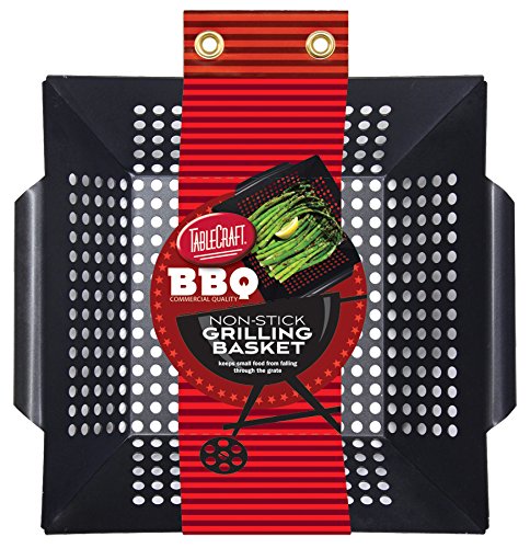 -. Binding : Kitchen -. Brand : Tablecraft -. Color : Black -. EAN : 0727875205292 -. Feature : Fast and convenient grilling basket keeps foods from falling through your grates / Designed for both gas and charcoal grills, perfect for high heat cooking and searing in flavors / Stamped design allows for more even cooking / Non-Stick and easy to clean, dishwasher safe / Overall size: 13" x 12" w x 3" d -. Label : Tablecraft -. Manufacturer : Tablecraft -. Model : BBQ1412M -. MPN : BBQ1412M -. PackageQuantity : 1 -. PartNumber : BBQ1412M -. ProductGroup : Kitchen -. ProductTypeName : KITCHEN -. Publisher : Tablecraft -. Size : Small -. Studio : Tablecraft -. Title : TableCraft BBQ1412M Non Stick 13 by 12-Inch Square Grilling Basket with Steel Handle, Small, Black -. UPC : 727875205292