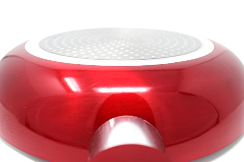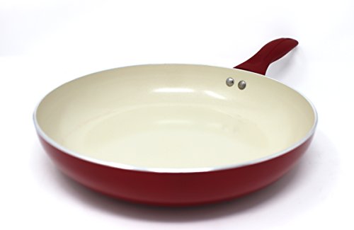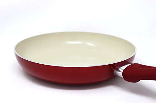 A 3 piece set of metallic red or metallic blue exterior frying pans with beautiful beige ceramic non stick interior. Set includes 8, 9.5, and 12".