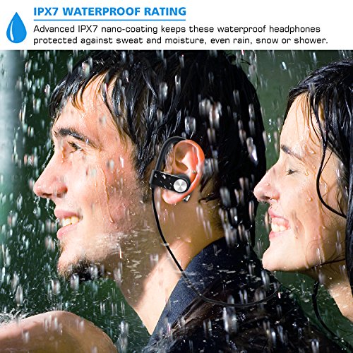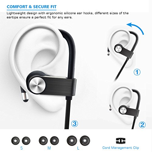 ✓ COMFORT & SECURE FIT DESIGN with IPX7 WATERPROOF RATING - With Ergonomic design and silicone ear hooks, these wireless sport earbuds are secure behind your ears and rest comfortably in the ear canal. Three sizes (S/M/L) of custom comfortable silicone earbuds ensure a comfortable and secure fit for everyone. Advanced IPX7 nano-coating keeps these waterproof headphones protected against sweat and moisture, even rain, snow or shower.