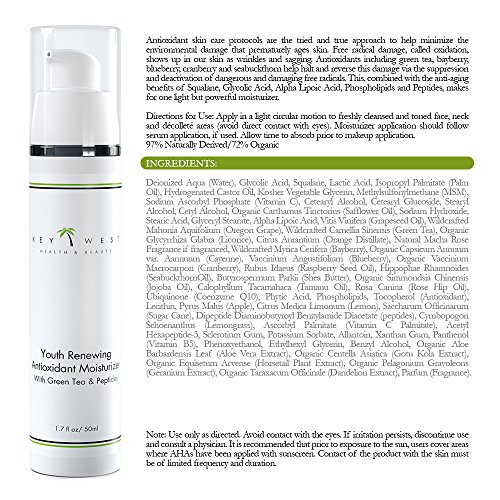 -. Feature : UNMATCHED ANTIOXIDANT COMBINATION - Along with Glycolic Acid, Green Tea and Peptides Galore, this synergistic youth renewing product packs one amazing moisturizing punch when it comes to protecting your skin and minimizing the damage done by environmental triggers. / 97% NATURALLY DERIVED AND 72% ORGANIC because, quite frankly, your skin deserves it. / EVERY SKIN TYPE WELCOME - One moisturizer to rule them all. Whether you have significantly dry skin, oily skin, sensitive skin or combination skin, this antioxidant formula not only suppresses but deactivates the free radicals responsible for damaging your skin and addresses what you need, where you need it. / CRUELTY-FREE - No Animal Testing - EVER! Because we've stayed as organic and pure as possible, we KNOW our product is amazing. Take heart in the fact that with us, you're not only doing something amazing for YOU, but for the world around you. / 100% SATISFACTION LIFETIME GUARANTEE - As always, your purchase is backed by our Key West Health and Beauty 100% Satisfaction Money Back Guarantee. There are no conditions - no limits - simply let us know if your skin is not a good fit for our product and we'll take care of you promptly and without delay.