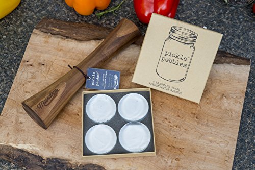 The Pickle Pebbles used together with the masontops Pickle Packer, ensure consistent high-quality results from your home ferments. The Pickle Pebbles have been specifically designed for use with fermentation and take the guess work out of your lacto ferments by ensuring your veggies stay below the surface of the brine thereby eliminating exposure to oxygen (which is the main cause of failure when using lacto fermenting methods). Pickle Pebbles PLUS have been specifically designed for us in Wide Mouth mason jars but can also be used Fido style jars, as well as traditional ceramic crocks. While a single Pickle Pebble is often enough to keep veggies below the brine, they can also be stacked to provide extra weight. Dimensions: 2.75 " diameter with 0.75 " thickness. Pickle Pebbles are made of non-iridized soda glass which is completely inert and guarantees that no other substances leach into your ferment. The Pickle Packer has been specifically designed for small-batch fermentation of sauerkraut and other veggies in both wide-mouth and regular-mouth mason jars. Measuring 10" tall, 2.5" at the wide end and 2" at the opposite end, our unique design allows both ends to be used for packing vegetables for your ferments. This allows the Pickle Packer to be used in a wide variety of fermenting jars and containers. Pickle Packers are made from all natural untreated Acacia wood and finished with a food-safe mineral oil to seal and protect. We chose to use Acacia wood not only because of its renowned strength (2 x as strong as maple) and durability, but also because it is sustainable and eco-friendly. Care Instructions: Hand wash with warm soapy and water only. Occasional oiling (using food-safe mineral oil) may help to lengthen the life of this product. Not dishwasher safe and should never be allowed to stand in water as it may damage the wood. 0