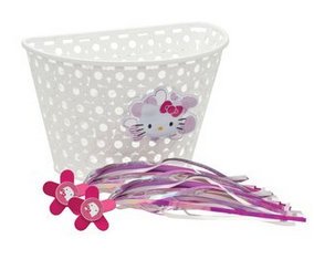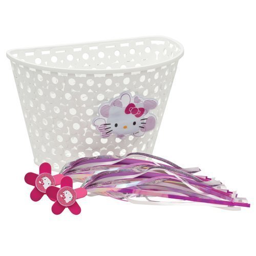 Product DescriptionGirl's Hello Kitty, white, bike basket with pink and purple SPINNING streamers. Hello Kitty is surrounded by pink glitter hearts.0