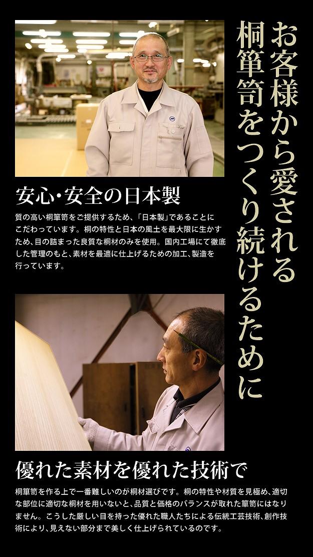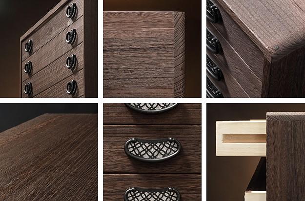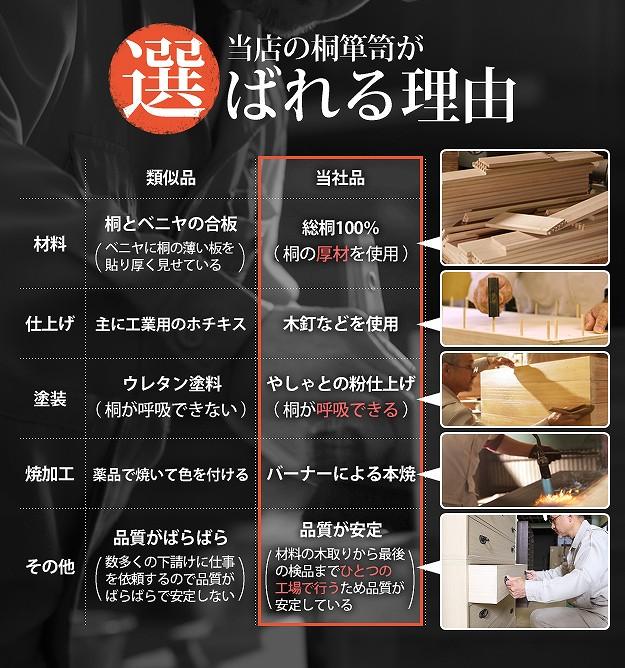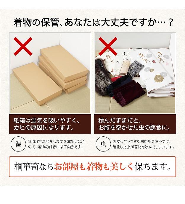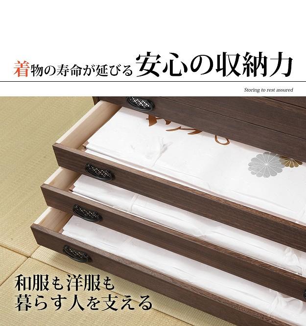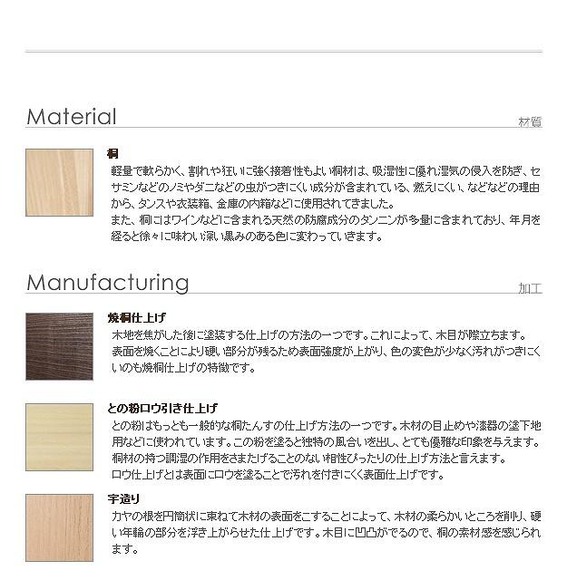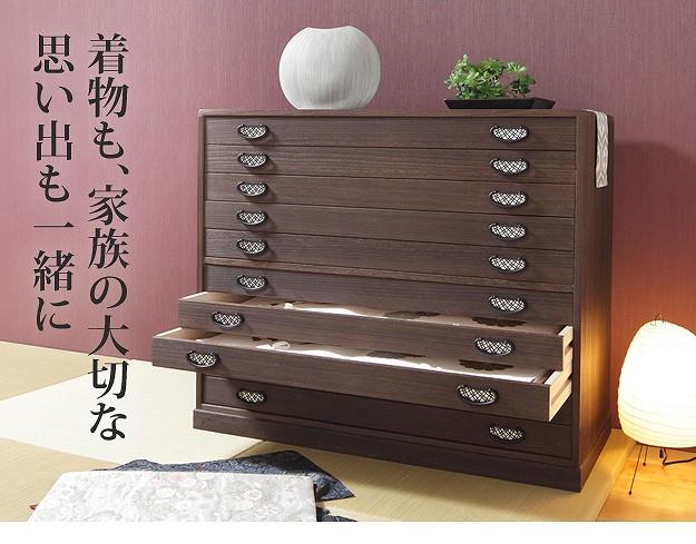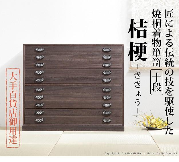 商品について:引出し10段の着物箪笥。趣のある焼桐仕上げです。18mm厚の天然木をふんだんに使用した贅沢なつくり。板が厚いと狂いも少なくなりますので、長くお使いいただけます。引出しはしっかりしたつくりの「留め加工」を用い、金釘を使用しておりません。また、引出しの横には溝がありますので、持ち運びの際に持ち手になり便利です。取っ手の金具には縁起が良いとされる七宝をあしらいました。たとう紙が入る大きさですので着物の収納に最適。匠による伝統の技で、堅牢に美しく仕上げたこだわりの桐タンスです。