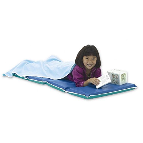 Heavy-duty blue and teal KinderMat for children to rest upon at school or daycare. The 4-section mat can be folded down to 12 x 24 inches for storage. Made of high quality foam and 10-mil vinyl, KinderMats do not contain any latex or harmful ingredients such as toxins, bleach, ammonia. Clean with soap and water. Made by the Peerless Plastics company in Minnesota. 0