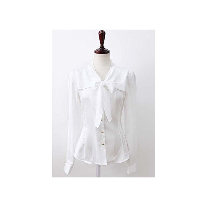 원본상품명: 【ノブランド品】サテン リボン シャツ ブラウス 3カラ ホワイト ブラック アプリコット (M, ホワイト)