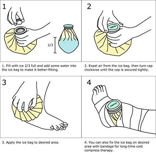 -. Feature : Package Included: 3 Bags - One Large (11"), One Medium (9"), One Small (6") / Superior leak resistant cap with large cap opening to allow for easy filling of ice cubes or crushed ice. / Made of waterproof soft touch rubberized fabric. Reusable and Economical. / Ideal for application of cold therapy to help reduce pain and swelling from minor scrapes, bruises, muscle aches, sprains and strains. Recommended to help relieve pain, reduce swelling, and speed recovery. Suitable for sport injury and first aid. / Stays cold much longer than gel packs or other cold packs.